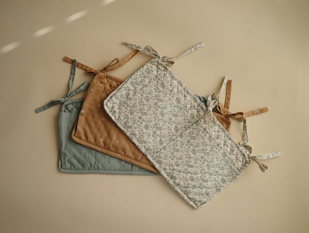 Mushie Crib Pocket er en elegant og multifunktionel lomme til tremmesengen, lavet af 100% bomuld, som passer til de fleste tremmesenge. Den vil hjælpe dig med at organisere babys nødvendige ting som sutter, vådservietter, bideringe og legetøj. Du kan nemt fastgøre lommen til tremmesengens stænger, rækværk eller hylder med de 3 sæt bånd.