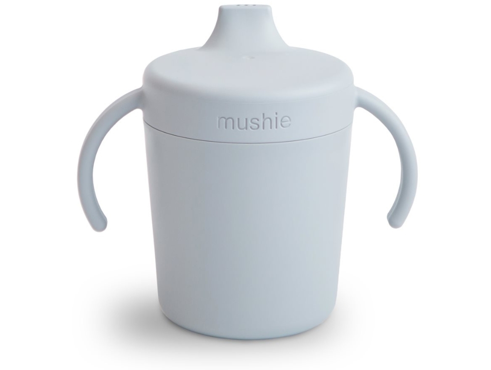 Tudekop i støvet blå (cloud) fra Mushie. Praktisk kop til børn med håndtag og låg, der gør det nemt at drikke selv.