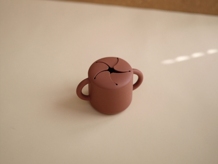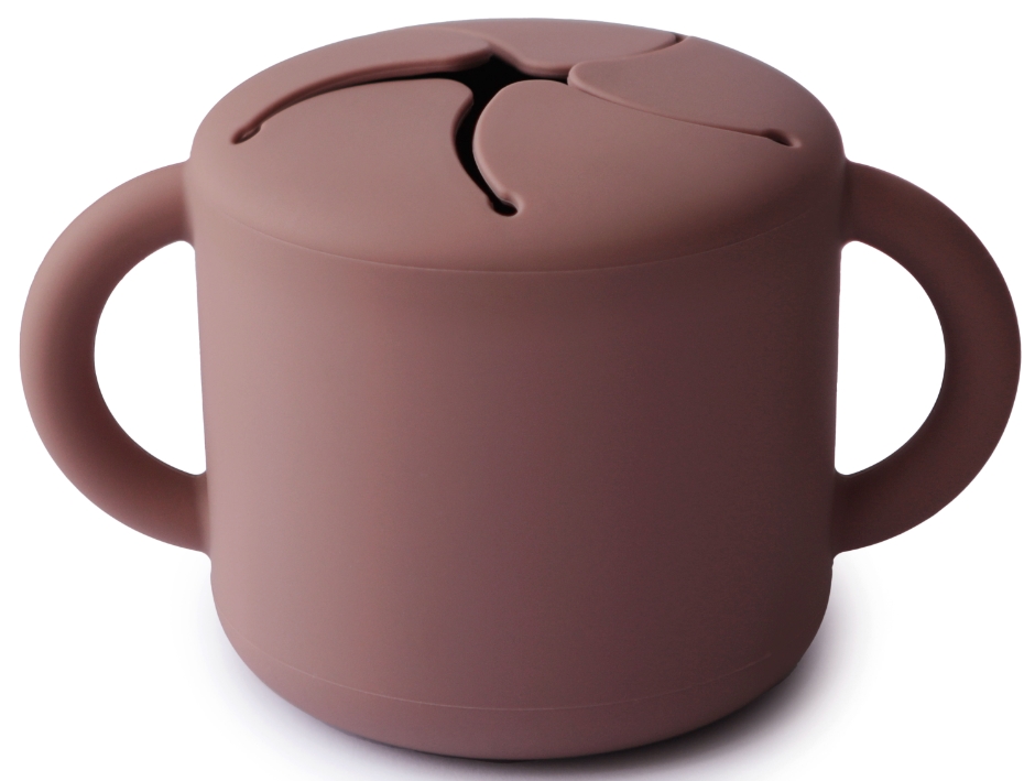 Super praktisk snack kop i blød silikone til de yngste i farven woodchuck fra Mushie.