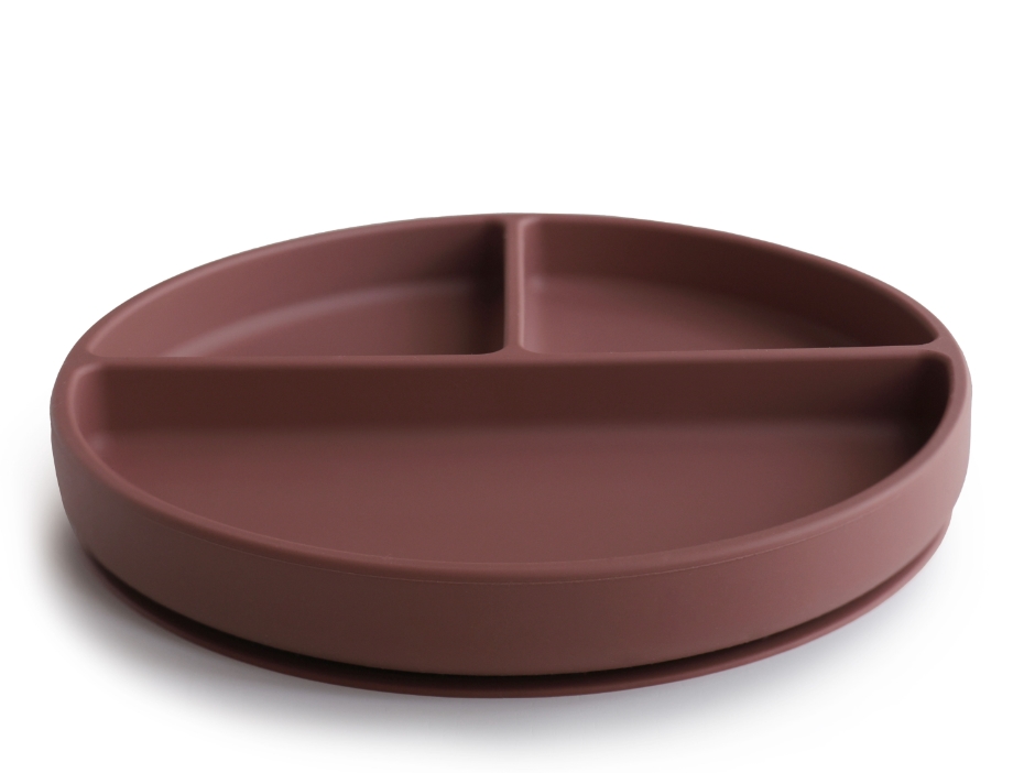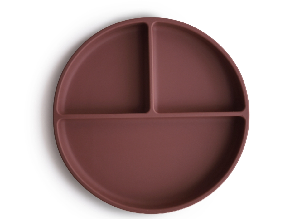 Skridsikker rund tallerken med rumdeling til de yngste i farven woodchuck fra Mushie.