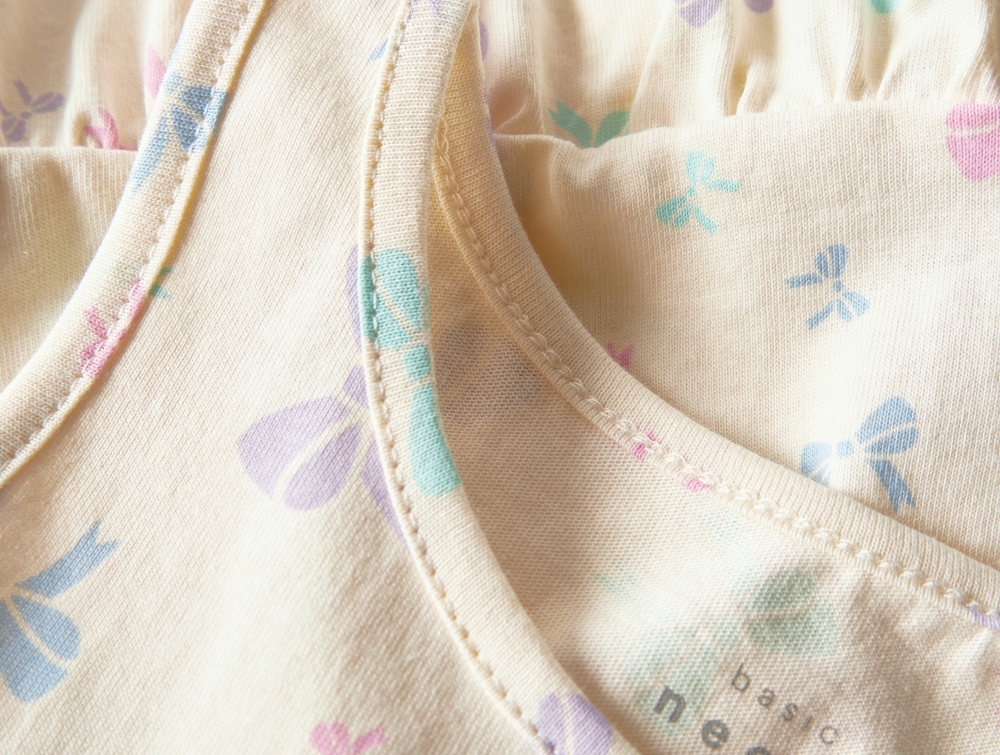 ærmeløs kjole fra Name It i buttercream med sløjfeprintnærbillede af sløjfeprint på Name It kjole i buttercream