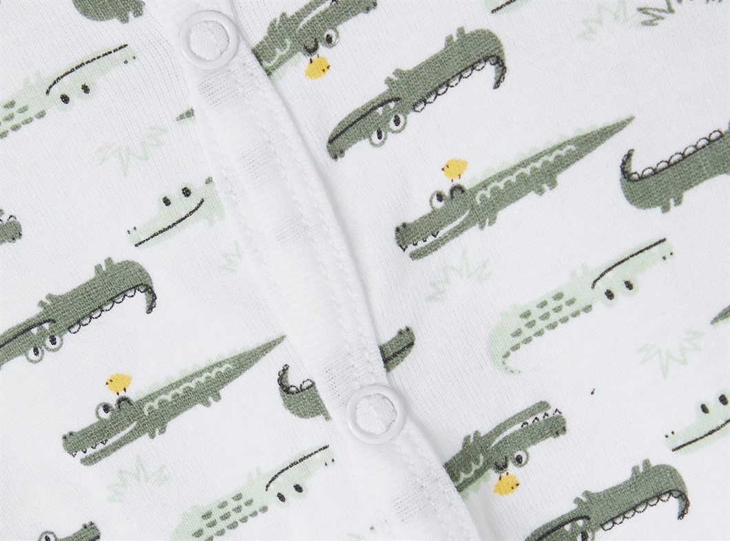 Den ene dragt er ensfarvet grøn med print af krokodille og den anden er hvid har all-over-print af krokodiller.
