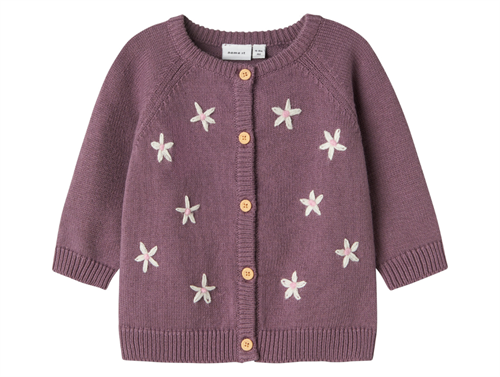 Strikcardigan i økologisk bomuld i farven arctic dusk med blomsterbroderi fra Name It.