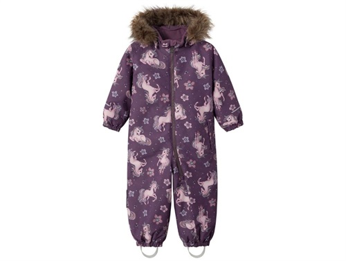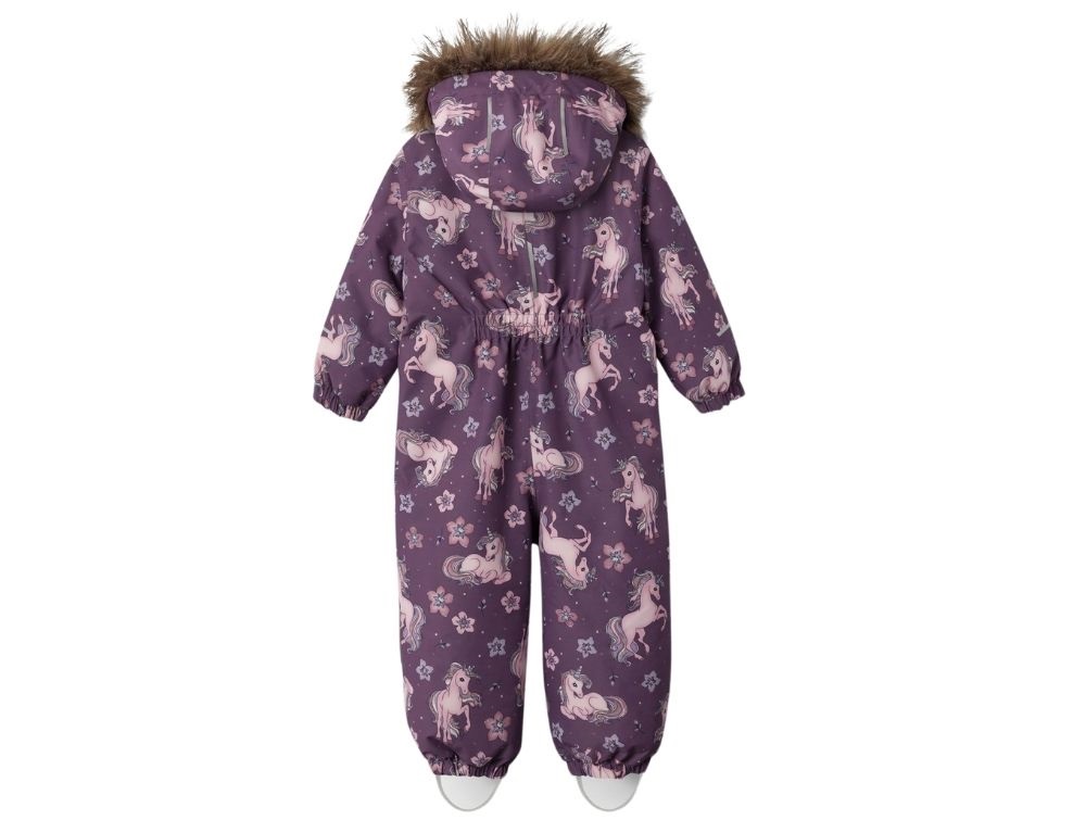 Flyverdragt i farven arctic dusk med enhjørningprint fra Name It. Flyverdragten har en aftagelig hætte med faux fur og trykknapper.