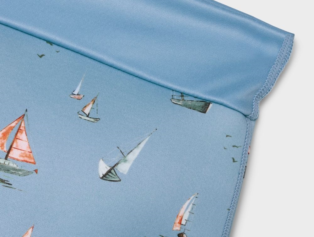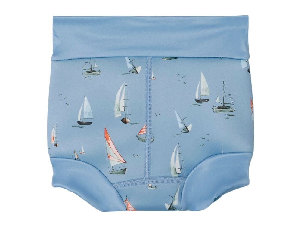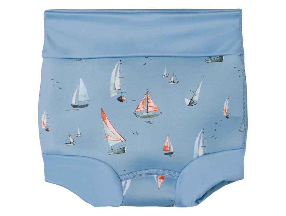 Neopren badebukser i lyseblå (mountain spring) med print af sejlbåde fra Name It.
