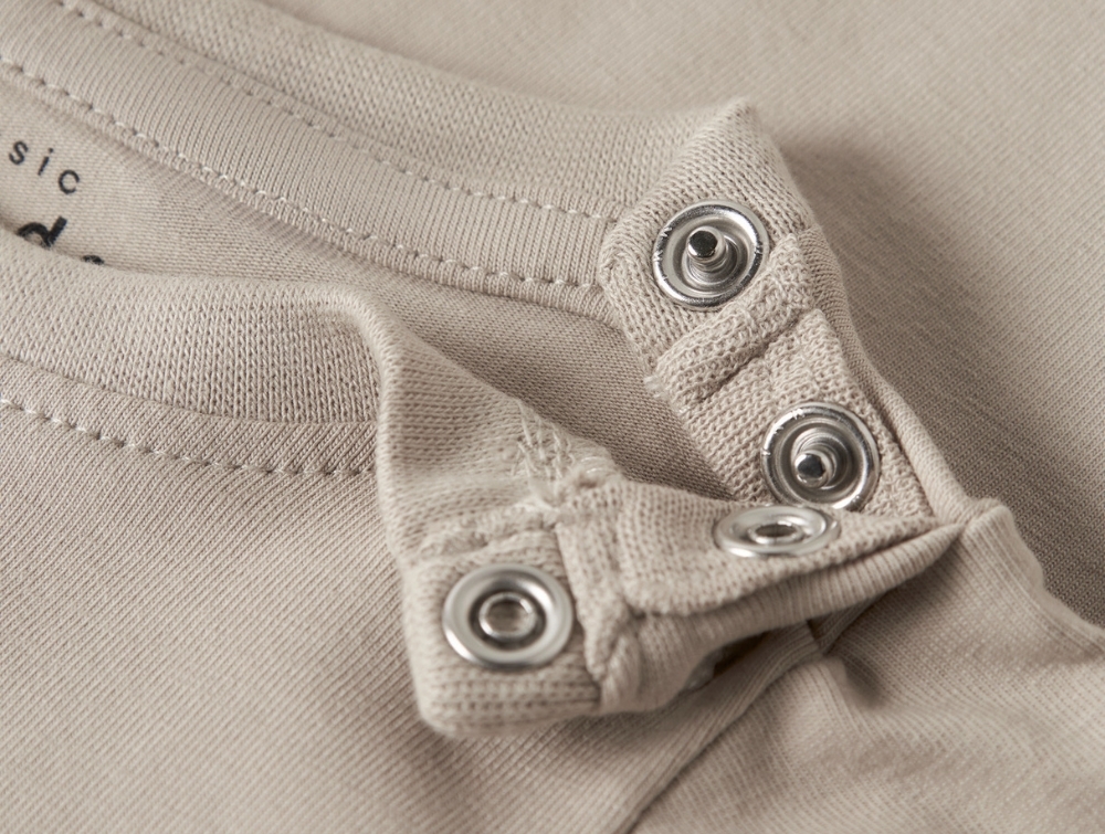 Bodyen har lange ærmer, rund hals og trykknapper ved skulderen og i bunden, så den er nem at tage af og på.