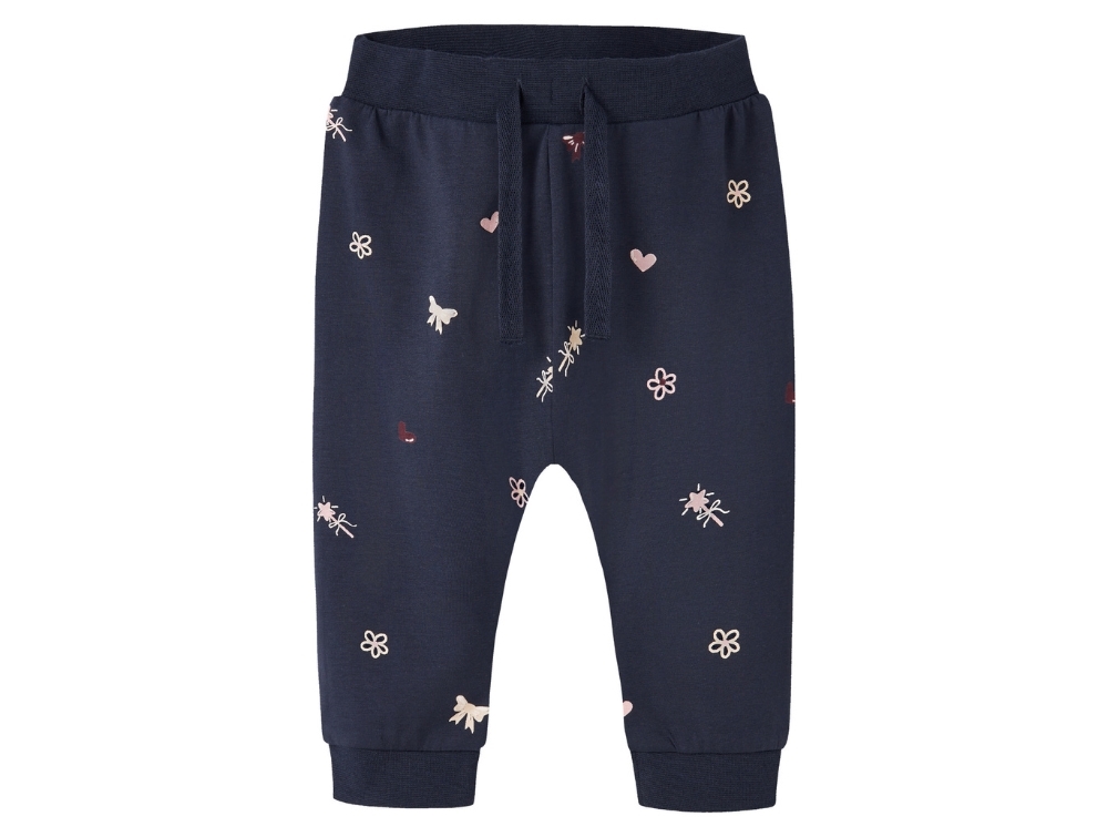 Bukser i mørkeblå nuance (navy blazer) fra Name It. De fine blomster- og hjerteprint giver et sødt udtryk, mens den bløde jerseykvalitet sikrer god komfort for barnet.