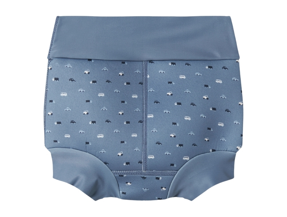 Badebukser i blå nuance (Vintage Indigo) fra Name It med allover print af små biler.