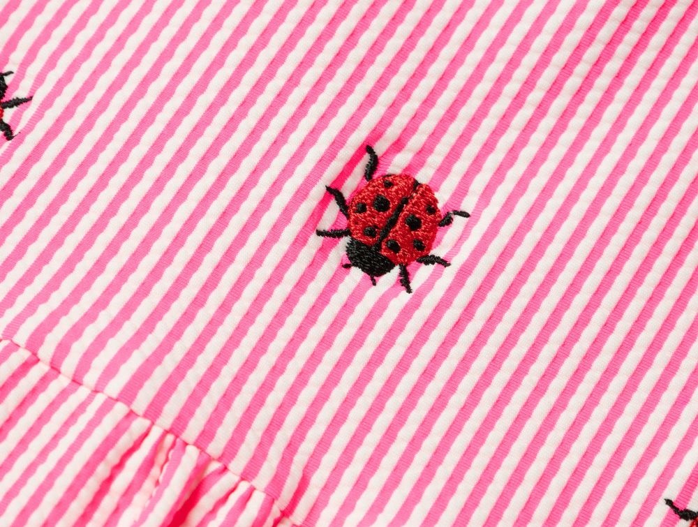 Sød badedragt i bæk- og bølgekvalitet med pink og hvide striber samt broderi af små røde mariehøns. Modellen har smalle stropper og et dobbelt flæseskørt i taljen, som tilføjer et feminint udtryk.