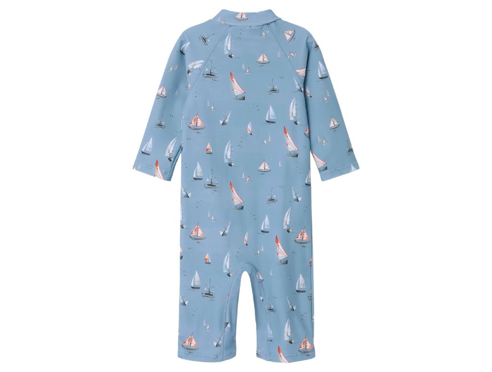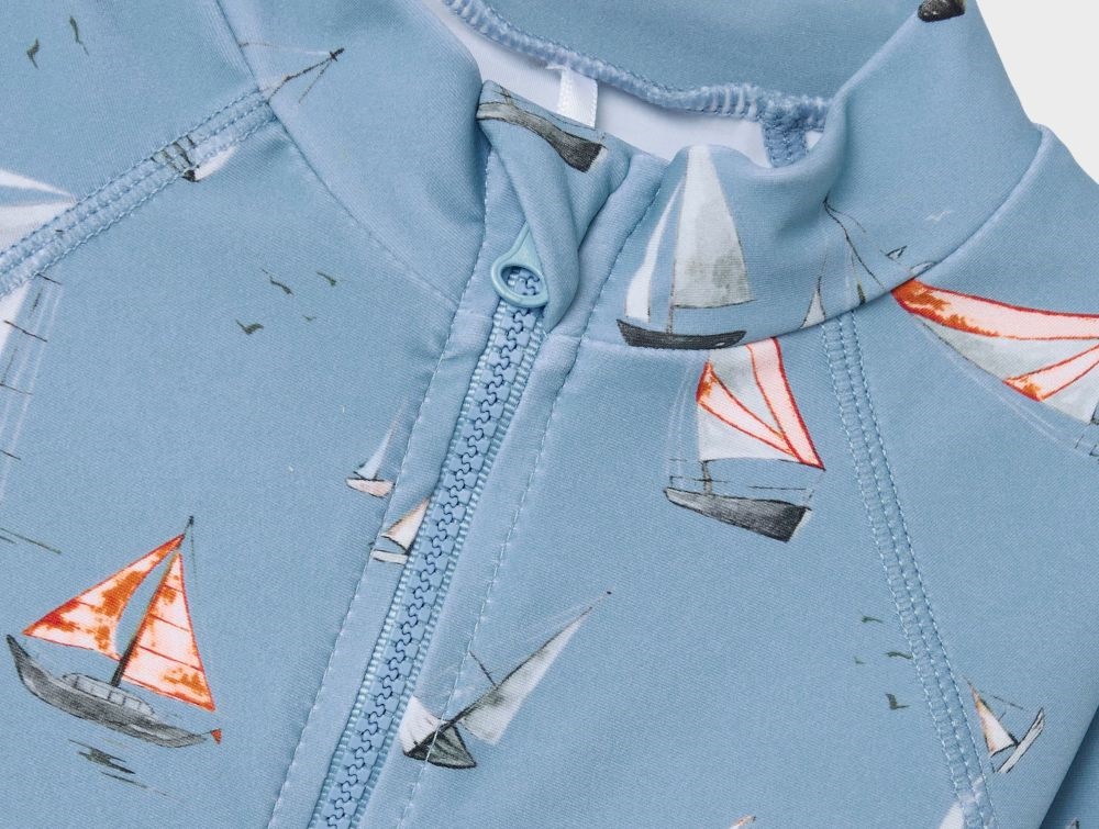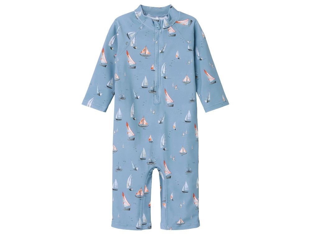 Badeheldragt i lyseblå (mountain spring) med print af sejlbåde fra Name It.