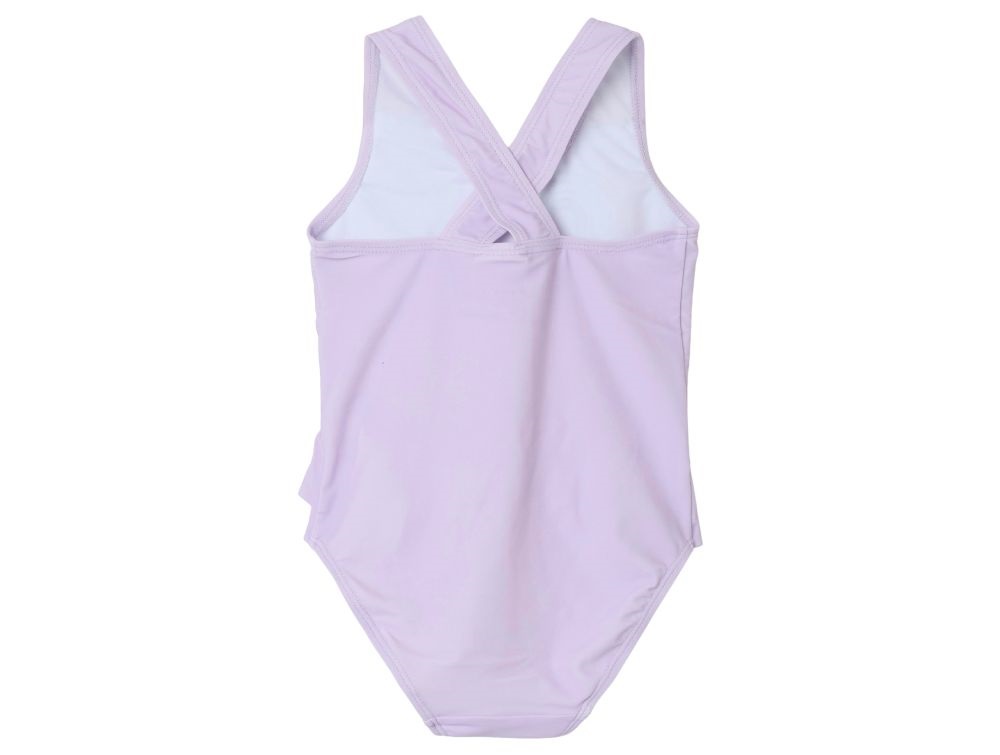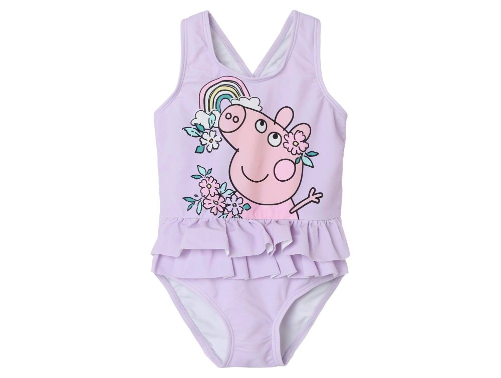 Badedragt i lilla (orchid bloom) fra Name It med sødt Gurli Gris-print og flæsedetaljer.