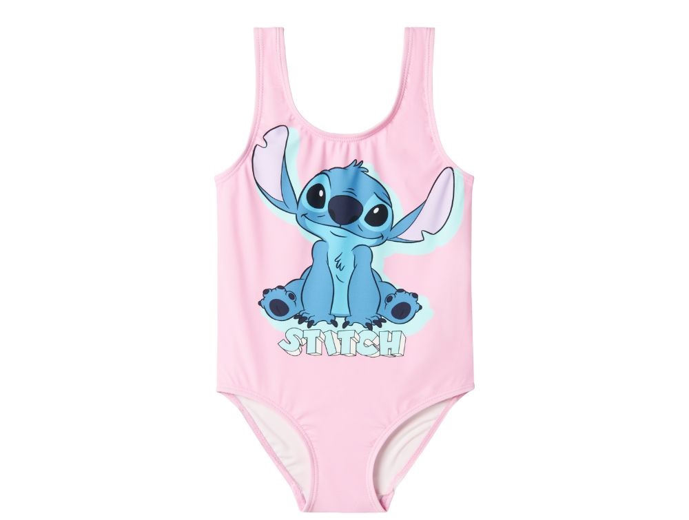 Badedragt i pink fra Name It med stort Disney Stitch-print på fronten.