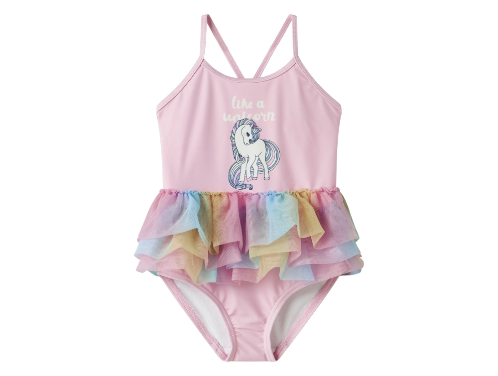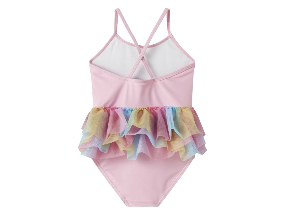 Name It badedragt i lyserød nuance med enhjørning og tylskørtName It badedragt pirouette enhjørning print detaljeName It badedragt pirouette krydsede stropper bagside