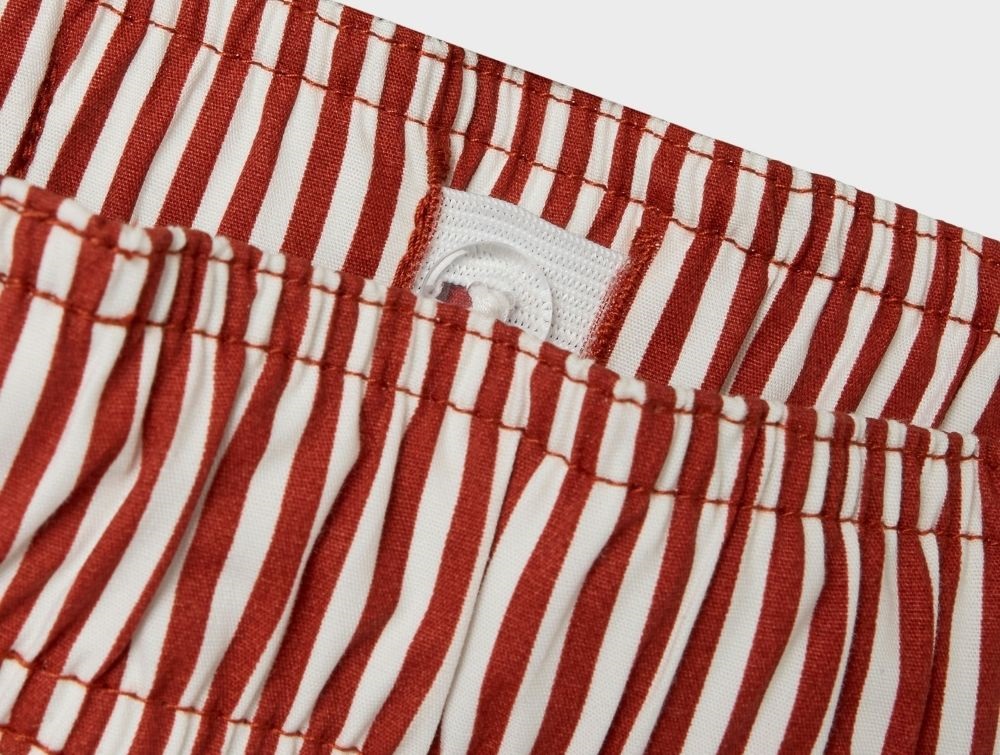 Letvægtsshorts med lodrette striber i rust- og hvide toner. Modellen har fastsnøret bindebånd i taljen, mesh-foring indvendigt og broderet detalje foran. Shortsene er lavet i vævet bomuld med let tekstur og klassisk udtryk – ideelle til sommerens strandture og vandleg.