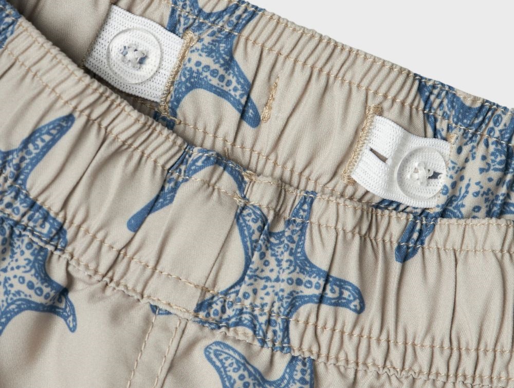 Sandfarvet badebukser med blå søstjerner fra Name it 13239792 pure cashmereSandfarvet badeshorts med blå søstjerner fra Name it 13239792 pure cashmere bagfraJusterbar knaphulselastik i sandfarvet badeshorts med blå søstjerner fra Name it 13239792 pure cashmere