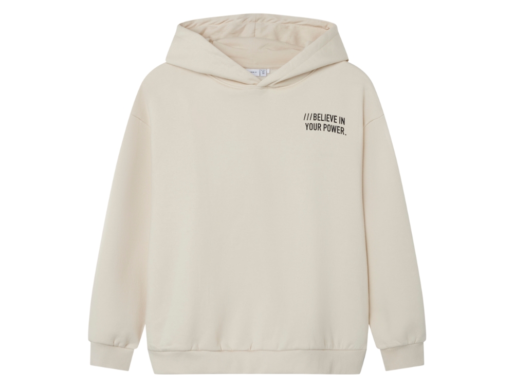 Hoodie i farven birch med cool tekst-print på front og ryg fra Name It.