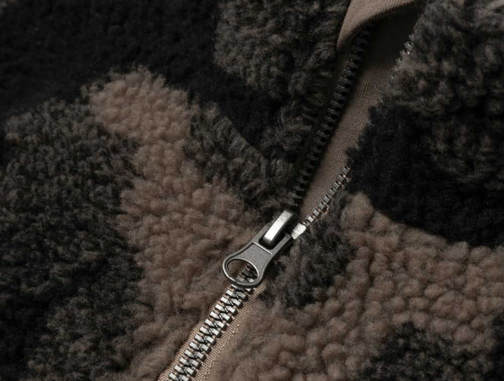 Lukkes med halv lynlås og har én forlomme med lynlås.