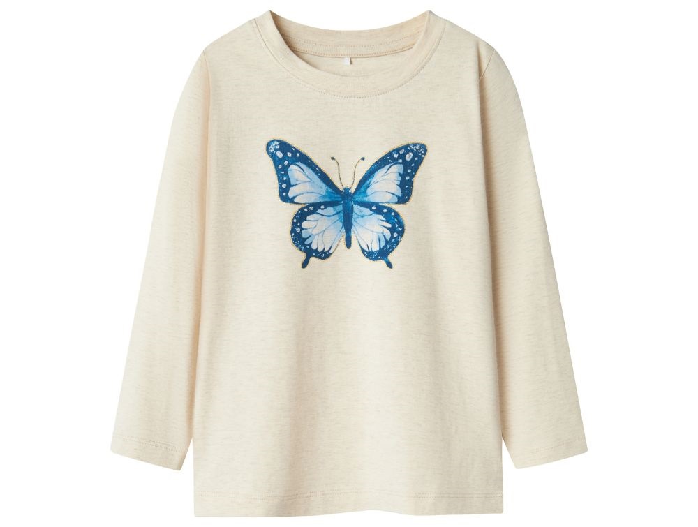 Blød og strækbar t-shirt med lange ærmer i en meleret beige nuance. Toppen har et flot print af en sommerfugl i blå nuancer med guldglitterdetaljer.