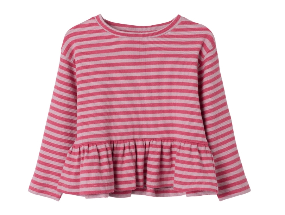 Fin stribet bluse i rosa og pink nuance (burnished lilac rapture rose) fra Name It. Blusen har lange ærmer, rund hals og en sød peplum-effekt forneden, der giver et let og feminint udtryk.