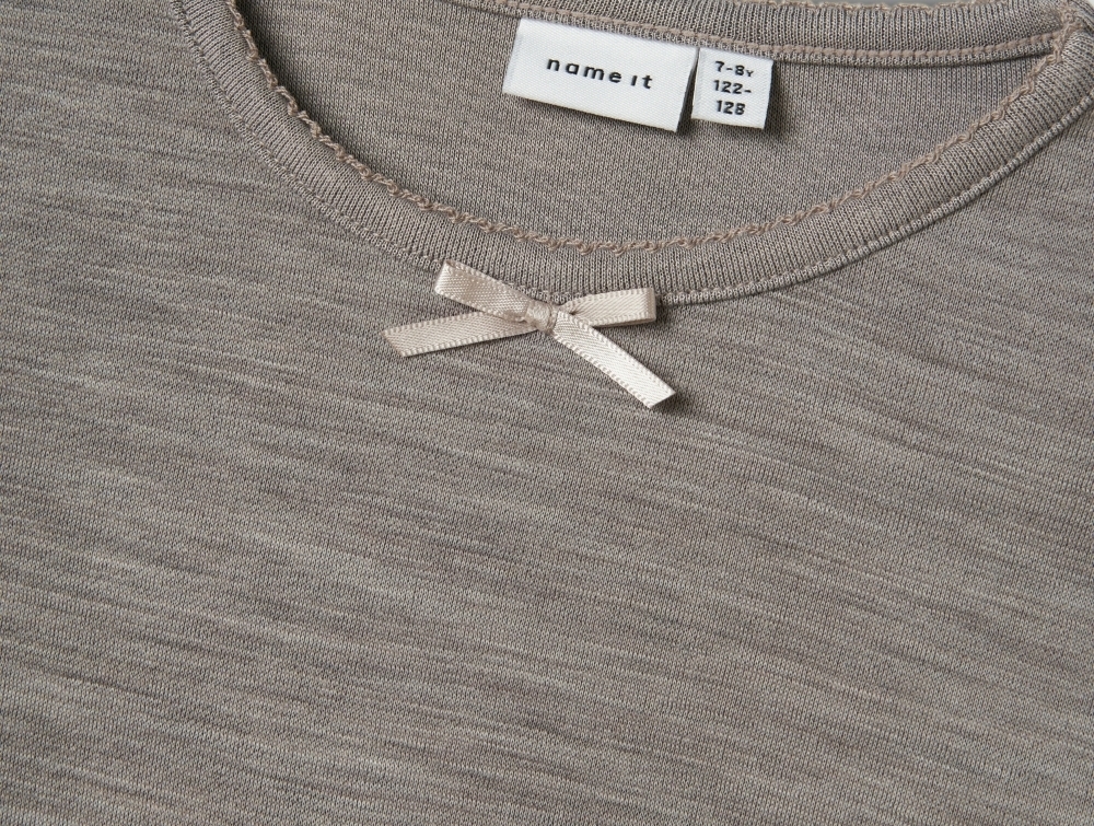 Name It bluse i grå-brun merinould mix med lange ærmerGrå-brun Name It bluse set forfra med sløjfe i halsudskæringDetalje af grå-brun Name It bluse med sløjfe og hæklet kantGrå-brun Name It bluse set bagfra i merinould mix