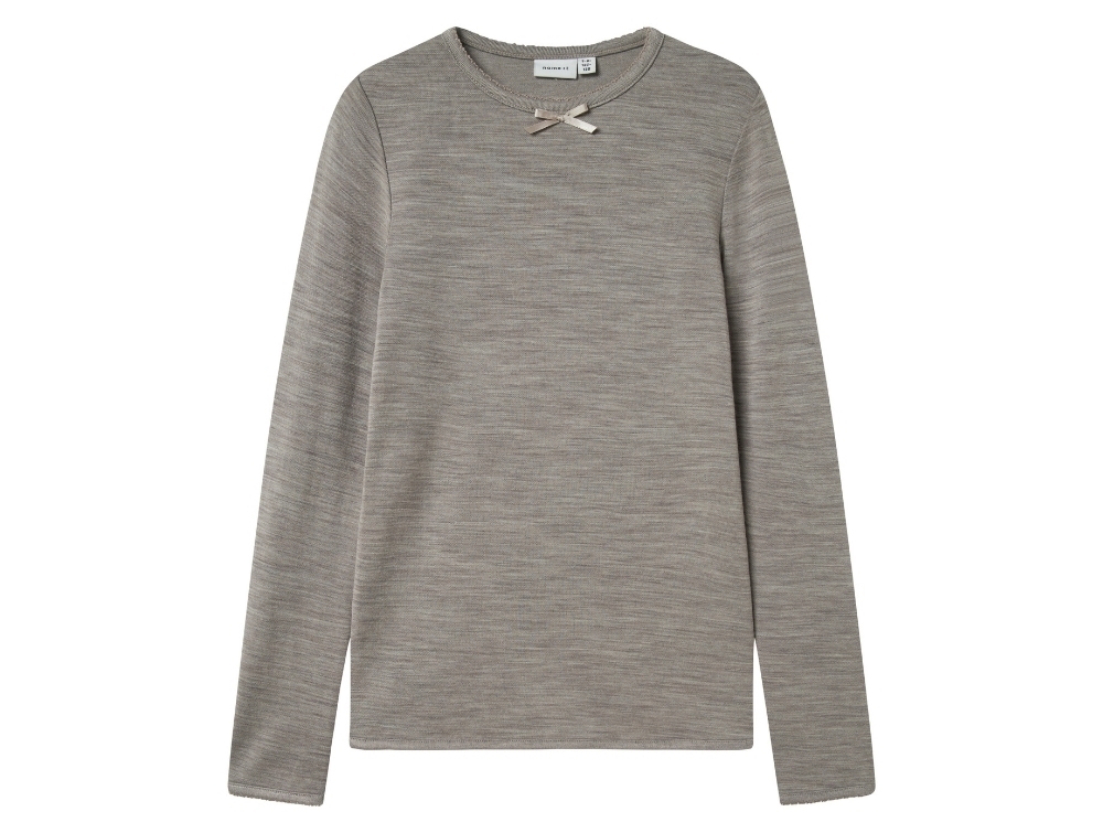 Bluse i grå-brun merinould mix med sløjfe fra Name It