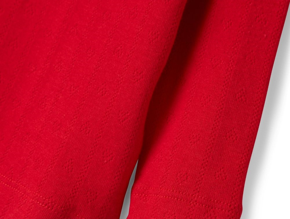 Blød og strækbar t-shirt med lange ærmer i en smuk rød nuance med fint pointellestrik, der skaber et dekorativt hulmønster med hjerter.