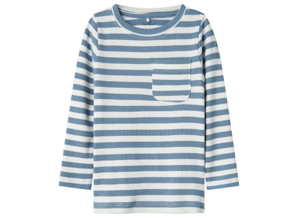 Blød og strækbar ribstrikket bluse fra Name It med smalle striber i blå og råhvid. Modellen har lange ærmer, rund hals og en lille brystlomme som fin detalje. Den tætsiddende pasform og det elastiske materiale gør blusen både behagelig og praktisk til hverdagsbrug.