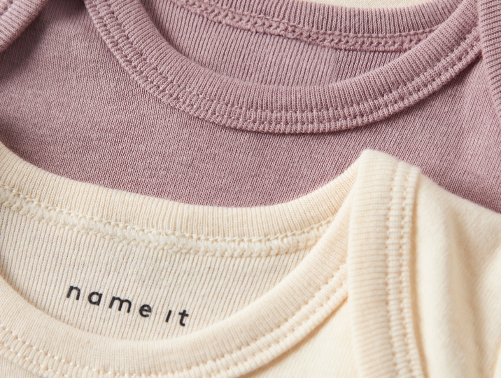 3-pak bodyer fra Name It i smukke, dæmpede nuancer: to i råhvid og én i rosa-lilla. Én body har små hjerter trykt over hele stoffet, mens de to andre er ensfarvede. Fremstillet i blød bomuld med økologisk indhold, som føles behagelig mod babyens hud.