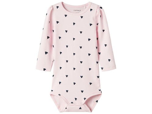 Blød og strækbar body fra Name It i en smuk lyserød nuance med et fint print af mørkeblå hjerter med glitter. En skøn og praktisk tilføjelse til barnets garderobe, perfekt til brug året rundt.