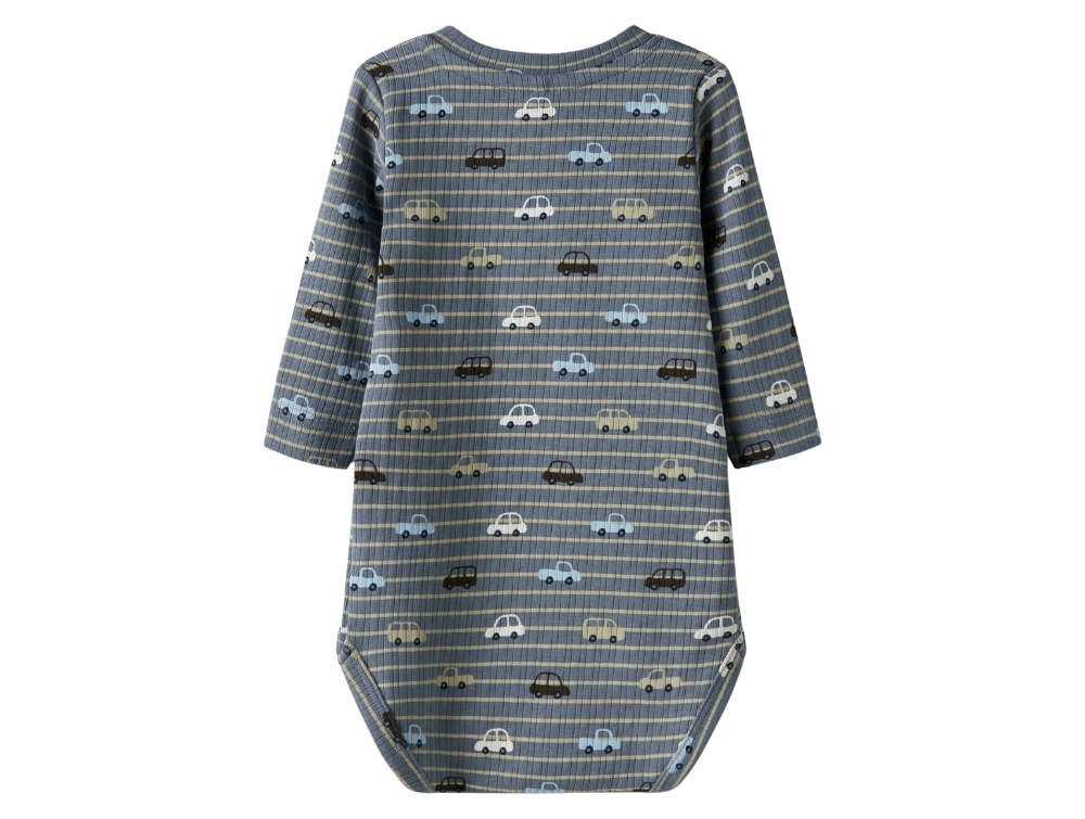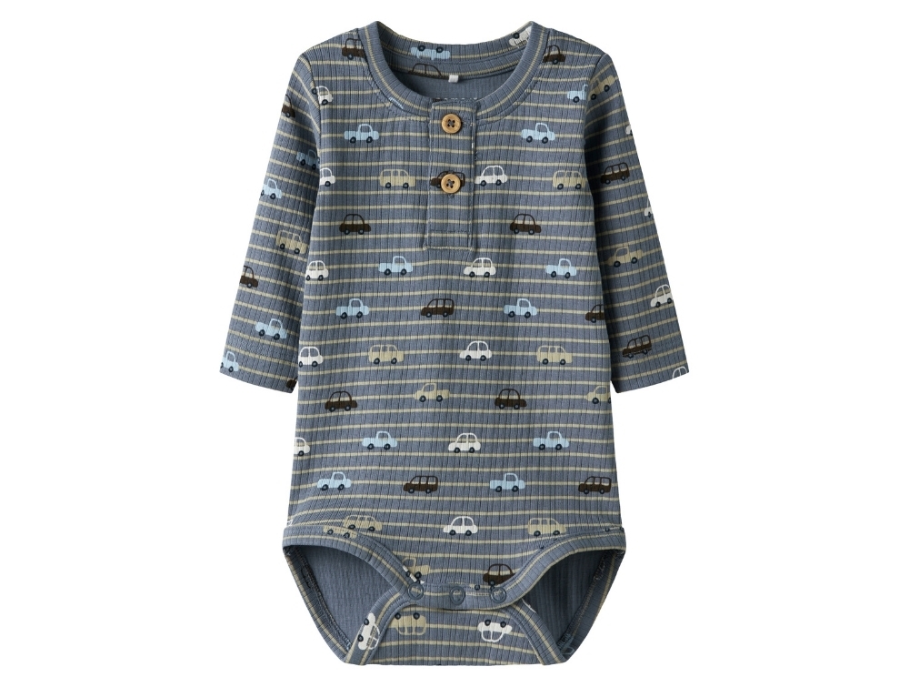Body i blå nuance (flint stone) fra Name It med små biler i et allover-print og knapper foran.