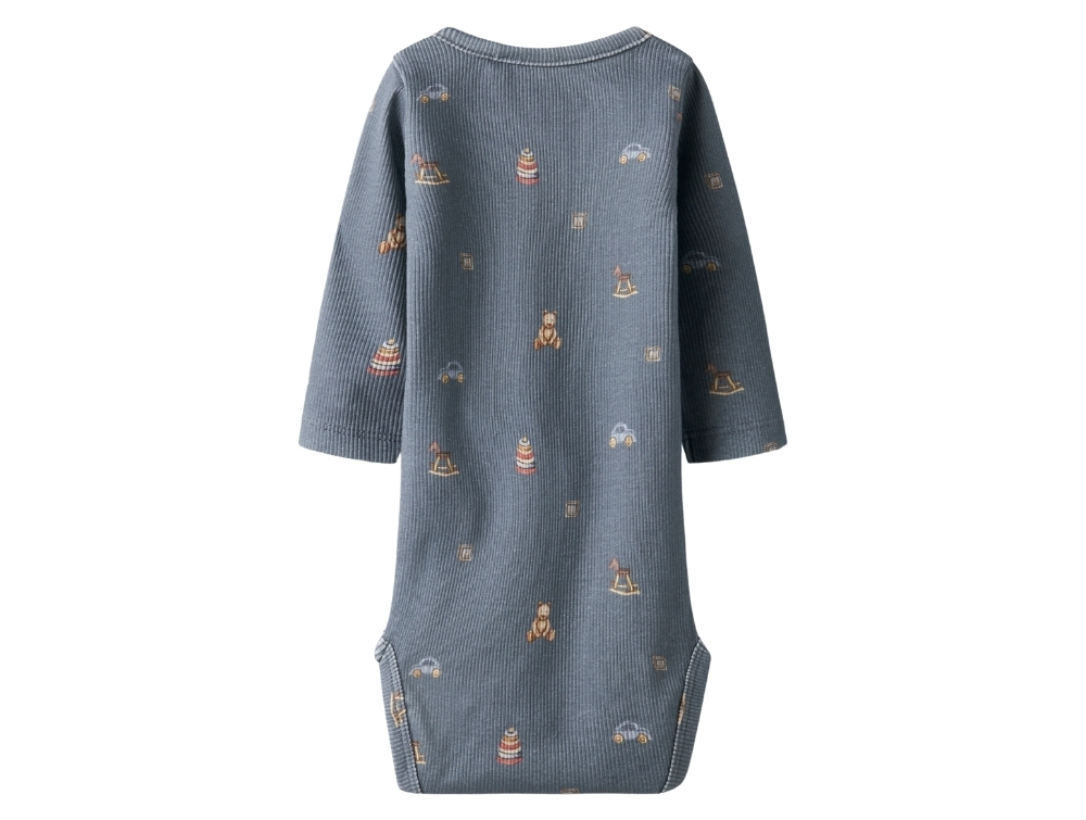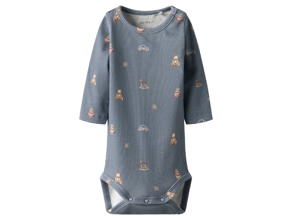 Body i blå nuance (flint stone) fra Name It i ribstrikket kvalitet med allover-print af klassisk legetøj som bamser, biler og stabletårne.