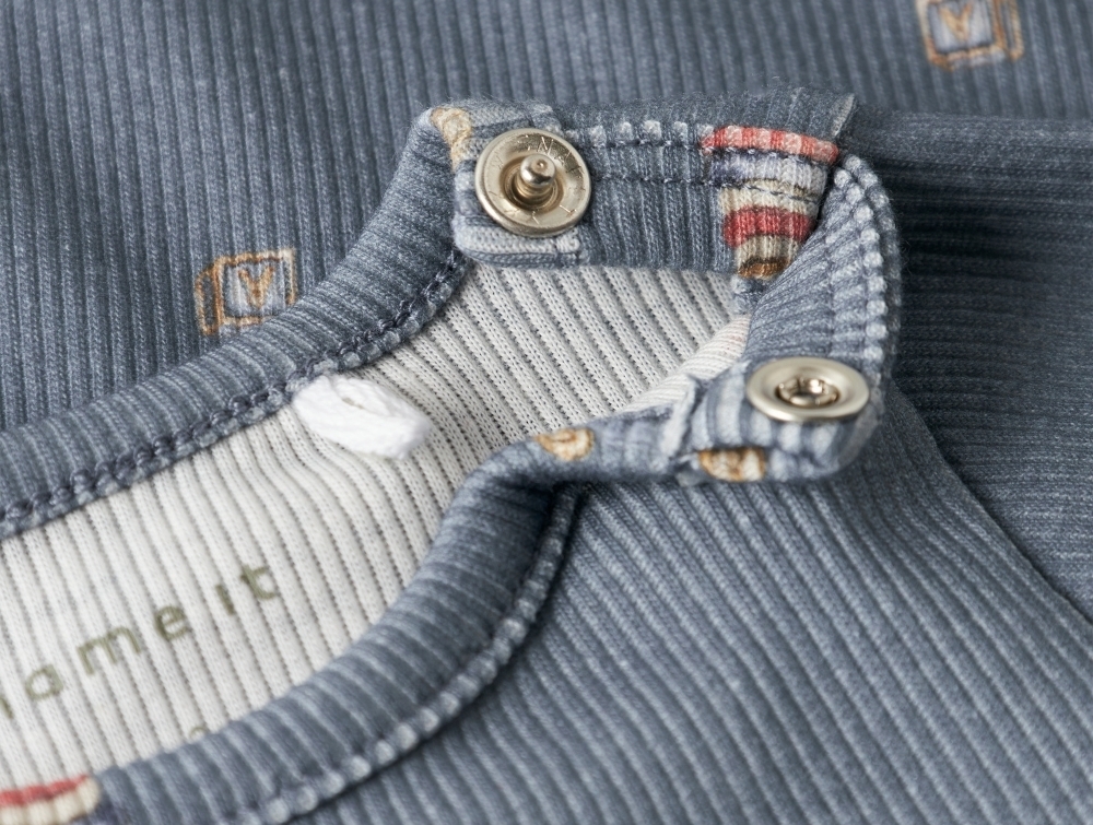 Name It body blå flint stone i rib med legetøjsprint foranDetalje af trykknapper på blå rib body fra Name ItName It body blå flint stone med allover legetøjsprint set bagfra