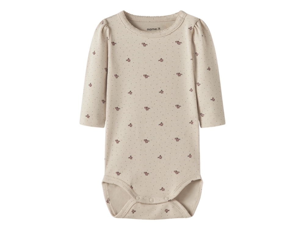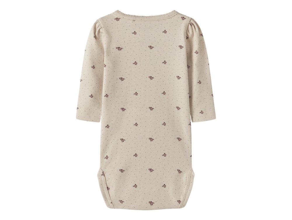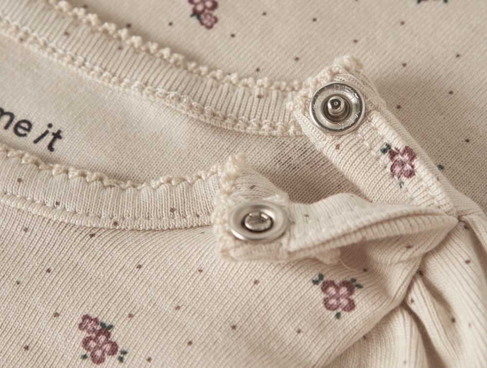 Name It body i råhvid nuance med blomsterprintName It body almond milk detalje med trykknapper ved skulderName It body i råhvid nuance med små blomsterprint bagfra
