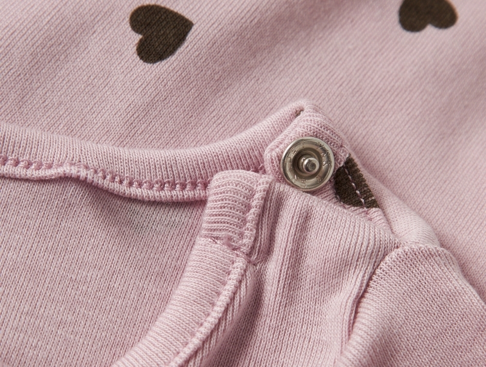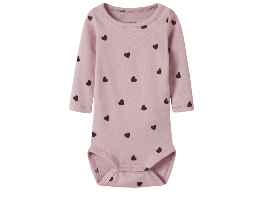 Body i rosa nuance fra Name It med sødt hjerteprint. Den bløde ribkvalitet føles behagelig mod huden og giver god bevægelsesfrihed til baby.