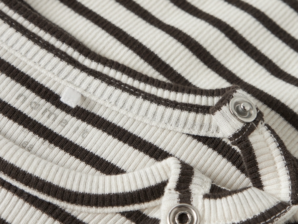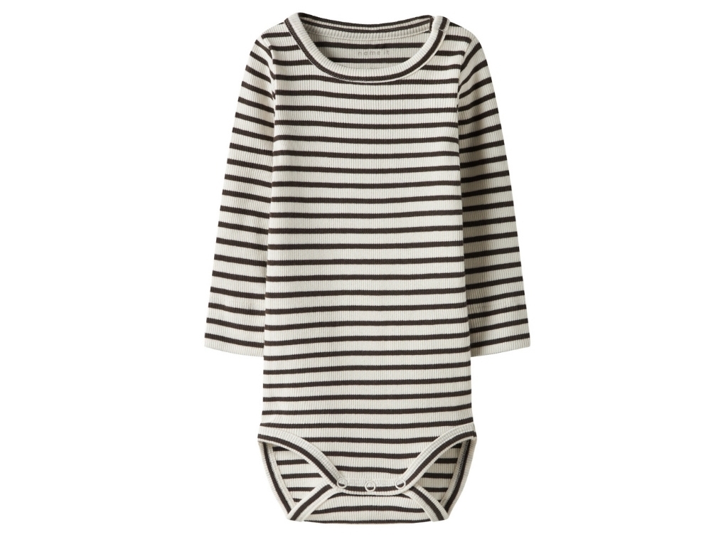 Body i råhvid nuance med mørkebrune striber fra Name It. En blød ribkvalitet med stræk, der giver en behagelig pasform og god bevægelsesfrihed til baby.