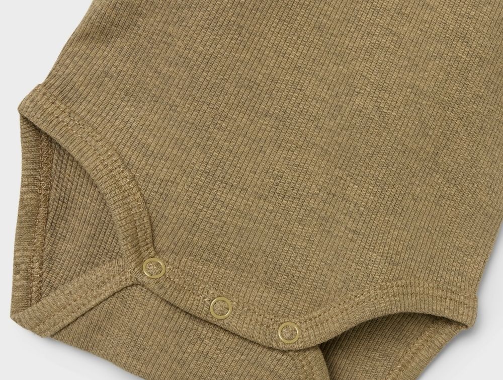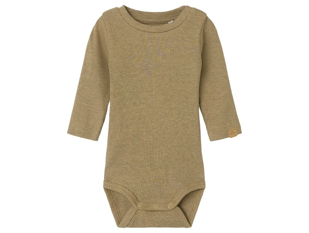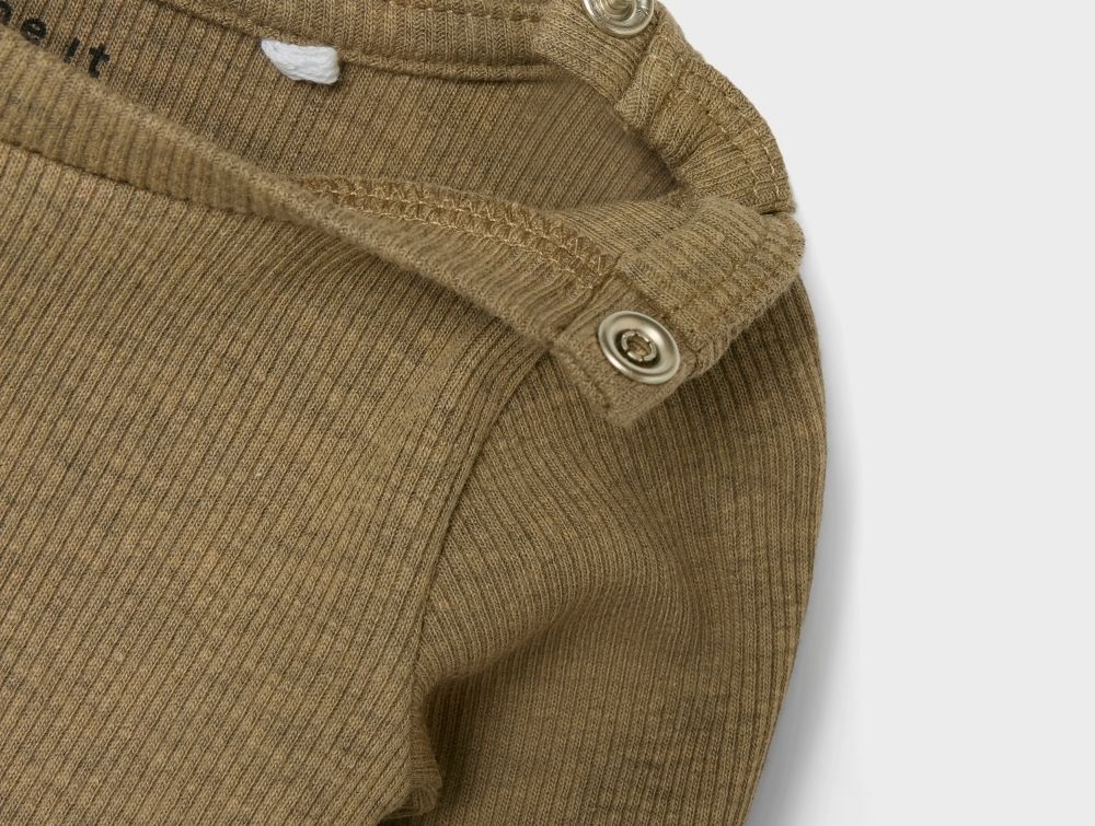 Blød og behagelig langærmet body fra Name It i en meleret brun nuance. Den ribstrikkede kvalitet giver god elasticitet og komfort, så barnet kan bevæge sig frit.