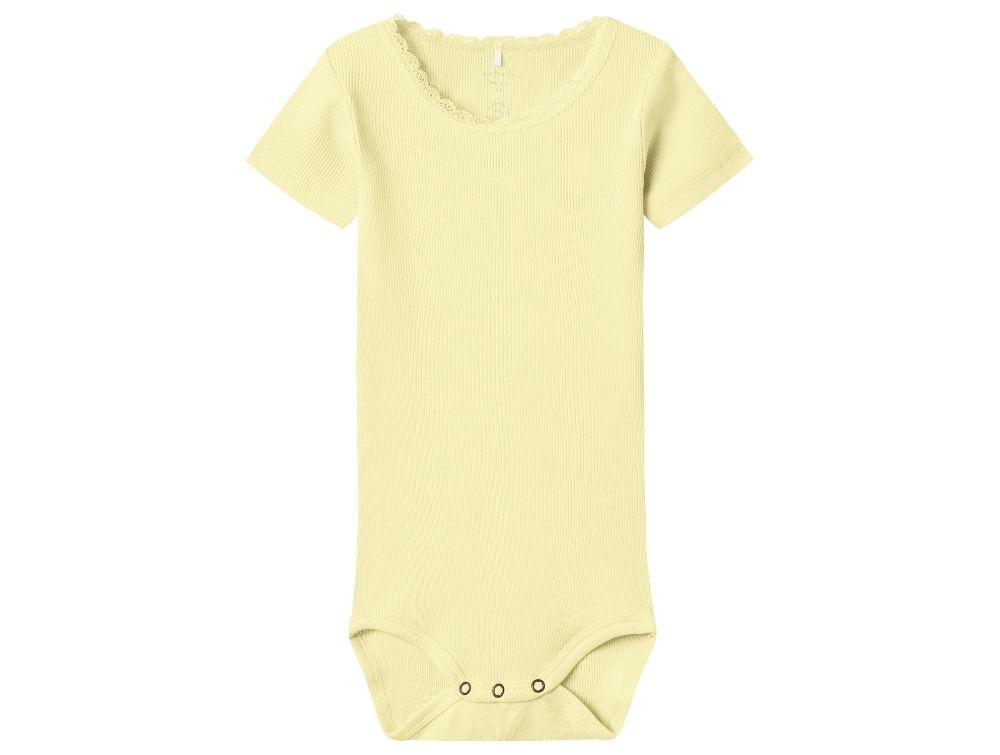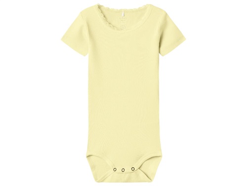 Kortærmet body i pastel gul (pastel yellow) med blonde ved halsåbning fra Name It.