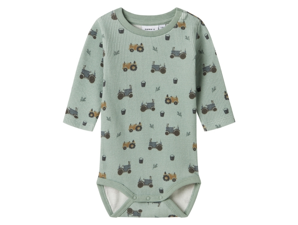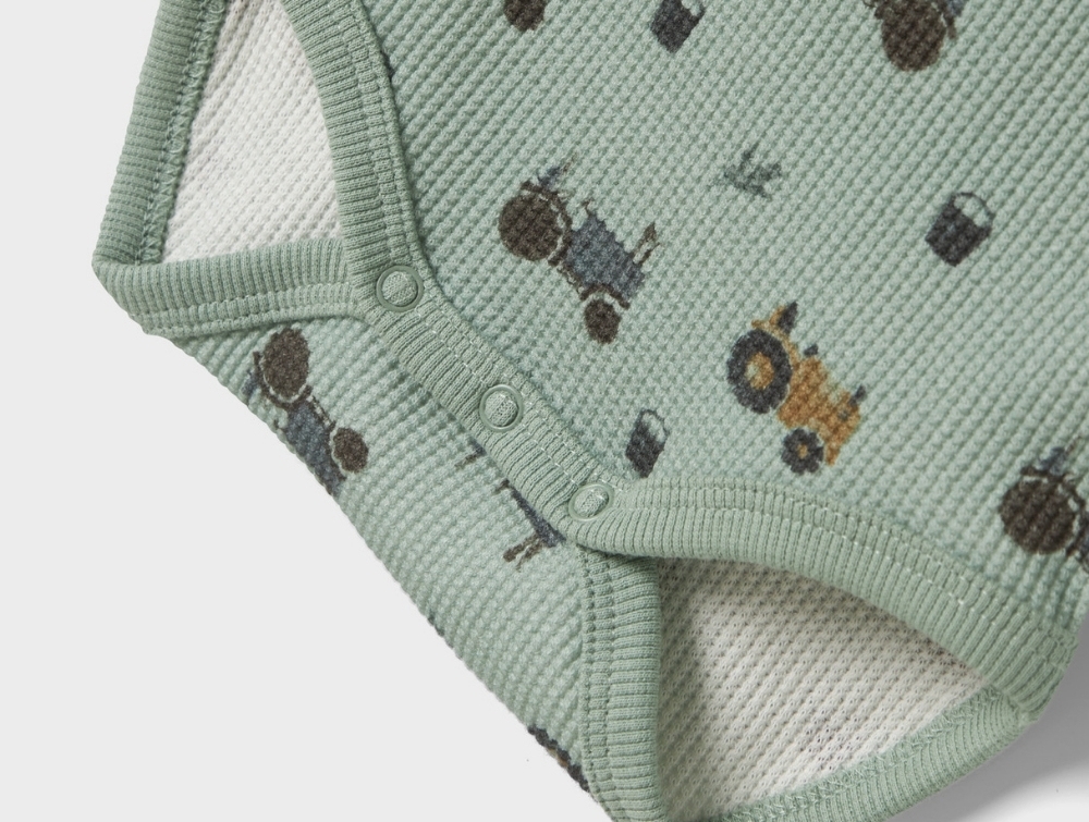 Body i støvet grøn nuance fra Name It med sjovt traktorprint. Fremstillet i blød vaffelstrik med en let struktur, der føles behagelig mod babyens hud og giver et flot udtryk.