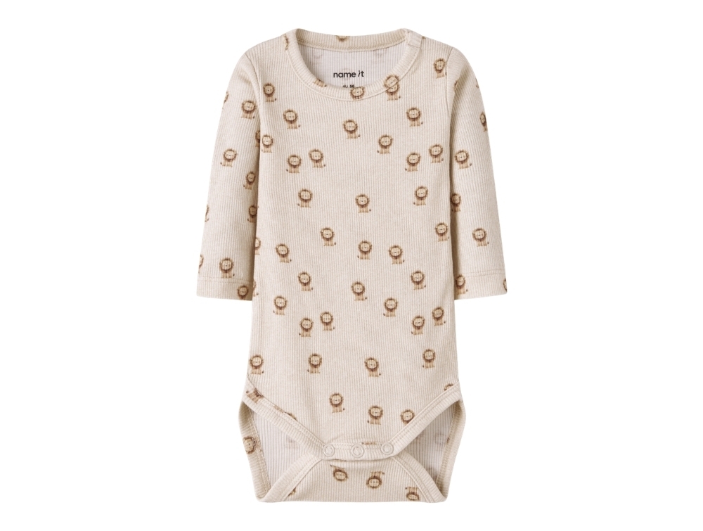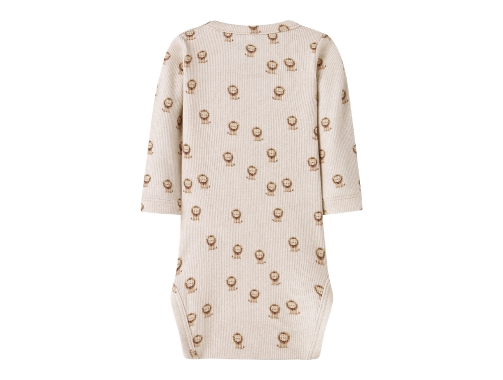 Body i beige nuance (Peyote Melange) fra Name It med print små løver og ribstruktur.