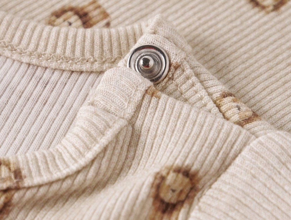Designet har lange ærmer, rund hals og trykknapper både ved skulder og i bunden, som gør den nem at tage af og på. De små løver er fordelt over hele overfladen og giver et enkelt og roligt udtryk.