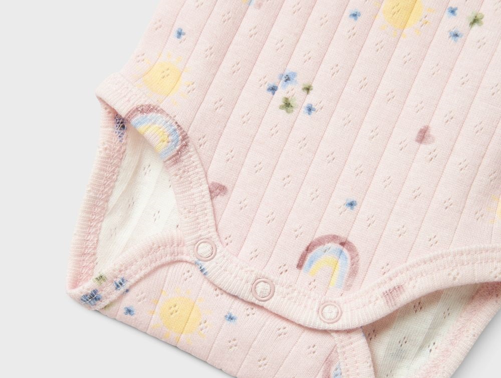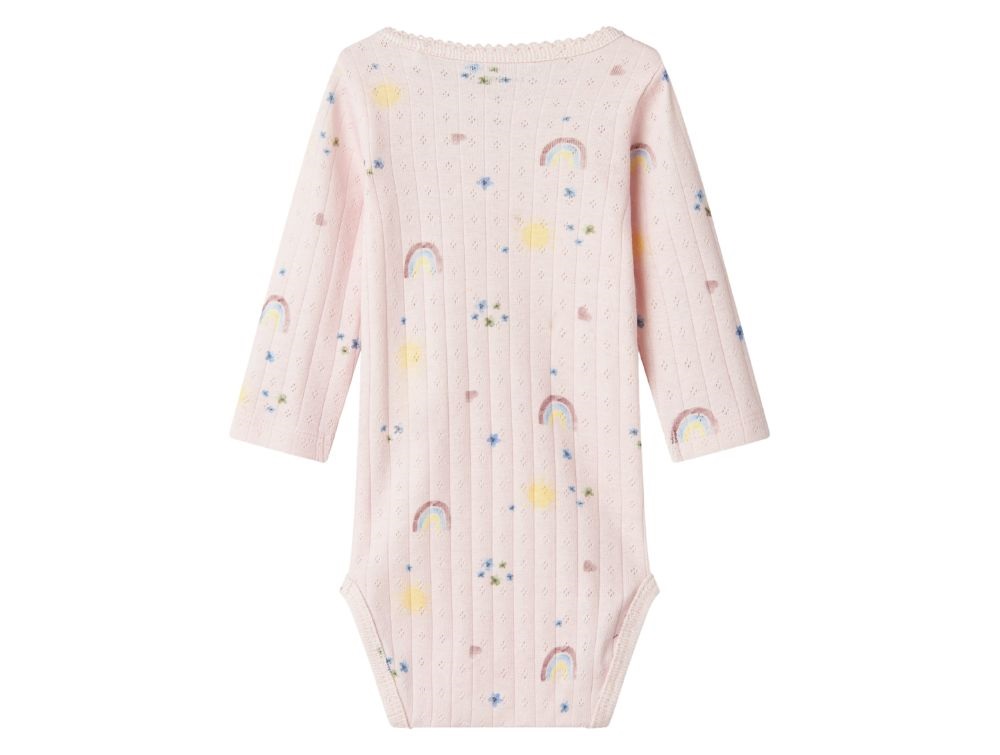 Blød og strækbar body i en lyserød nuance med sødt print af regnbuer, sole, blomster og små hjerter. Bodyen har et fint vertikalt hulmønster, rund hals med delikat tungekant og lange ærmer. Trykknapper på skulderen og mellem benene gør det nemt at tage bodyen af og på. En behagelig og sød style til brug året rundt.