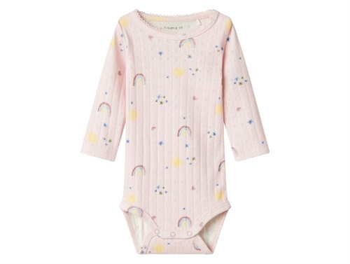 Lyserød  hulmønsteret body medprint af regnbuer, sole, hjerter og blomster fra Name It 13241099 light lilacLyserød  hulmønsteret body medprint af regnbuer, sole, hjerter og blomster fra Name It 13241099 light lilac bagfraKnaplukning i bunden på lyserød hulmønsteret body medprint af regnbuer, sole, hjerter og blomster fra Name It 13241099 light lilac