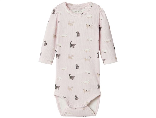 Blød og strækbar body fra Name It i en smuk violet nuance med et fint print af små katte i hvide og grålige nuancer. En skøn og praktisk tilføjelse til barnets garderobe, perfekt til brug året rundt.