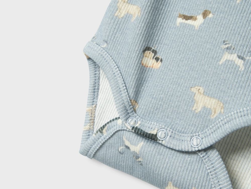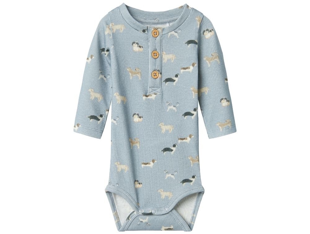 Blød og strækbar body i en fin blå nuance med et sødt print af hunde. Bodyen er fremstillet i en ribstrikket kvalitet, der giver god bevægelsesfrihed og en behagelig pasform.