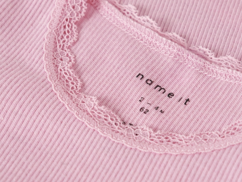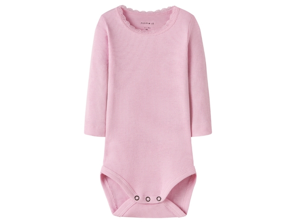 Body i rib fra Name It i lyserød nuance med fin blondekant ved halsen. En klassisk model med lange ærmer og rund hals, som giver et sødt og enkelt udtryk. Perfekt til både hverdag og pænt brug.