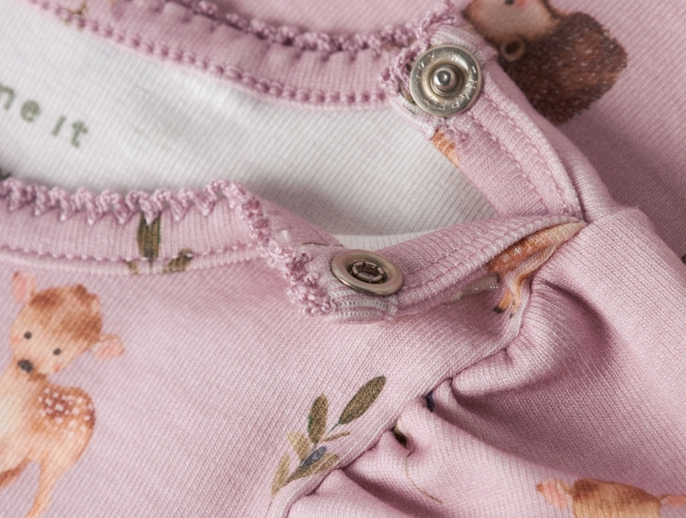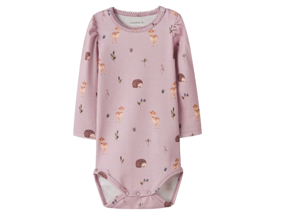 Body i lyserød nuance (burnished lilac) fra Name It med yndigt print af rådyr, pindsvin og små blade.