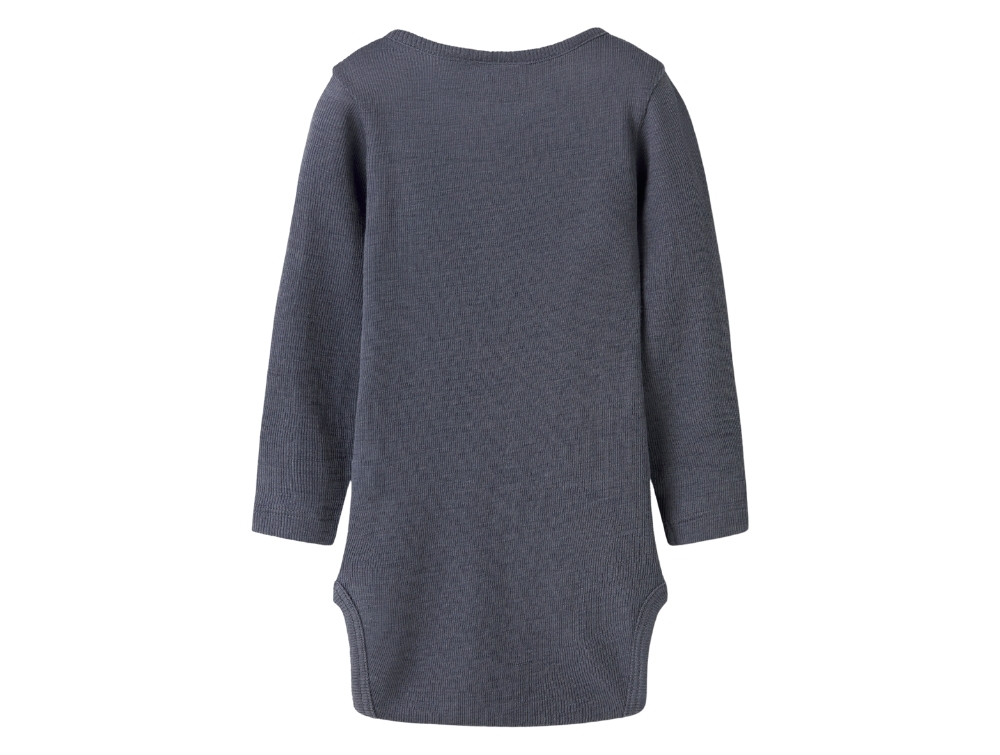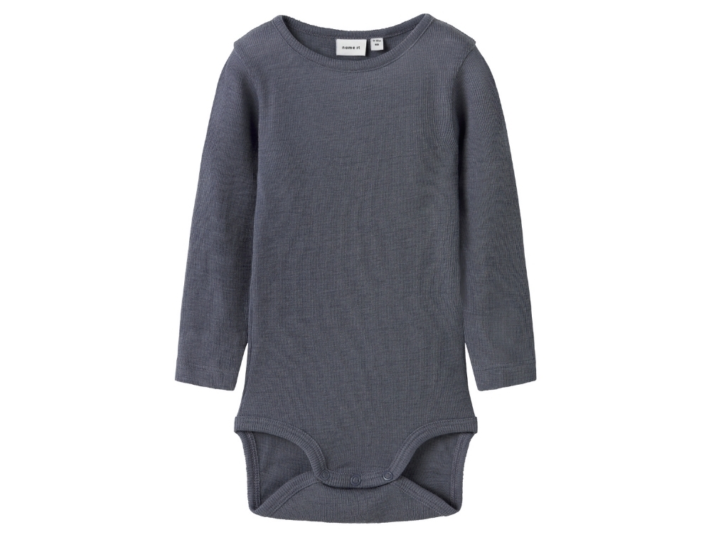 Body i blågrå nuance (folkstone gray) fra Name It i en luksuriøs blanding af merinould og silke.