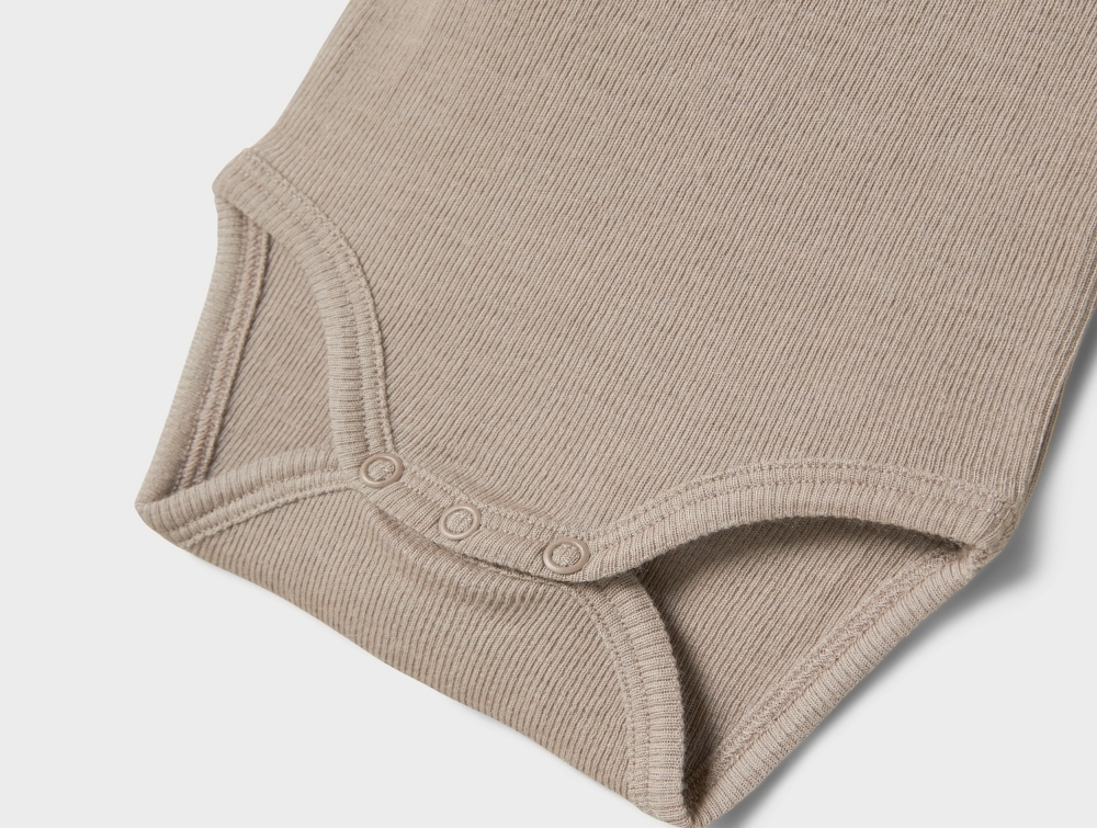 Name It body i satellite grå brun nuance i merinould og silke med ribmønster set forfraName It body i satellite grå brun nuance i merinould og silke med ribmønster detalje af trykknapperName It body i satellite grå brun nuance i merinould og silke med ribmønster set bagfra