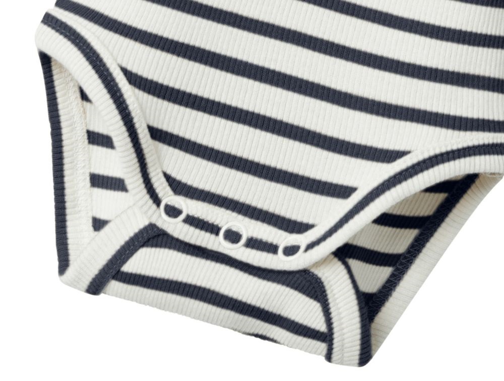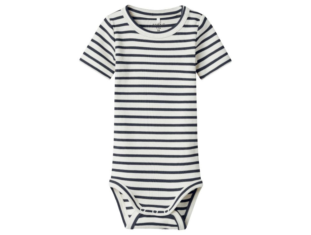 Blød og strækbar kortærmet body fra Name It med fine klassiske striber i mørkeblå og hvid. Bodystockingen er lavet i ribstrik af en blanding af økologisk bomuld, modal og elastan, der sikrer en behagelig pasform og god bevægelsesfrihed til hverdagsbrug.