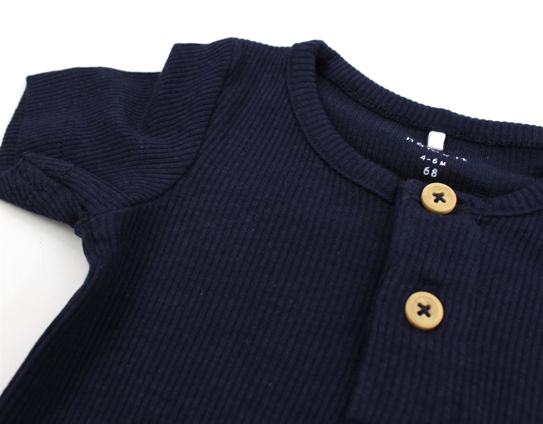 Forny din babys garderobe med denne klassiske mørk blå kortærmede body fra Name It. Bodyen er lavet af en blanding af 57% økologisk bomuld, 38% modal og 5% elastan, hvilket giver en blød og behagelig kvalitet.